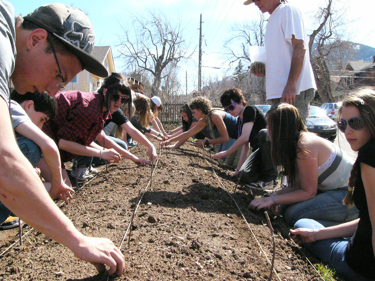 After researching more about food miles, students wanted to increase an awareness about this issue at their school. They volunteered at Flatirons Neighborhood Farm and Growing Gardens to get tomato plants and worked with a member from Square Foot Gardens to plant square foot tomato plots in the New Vista High School community garden.