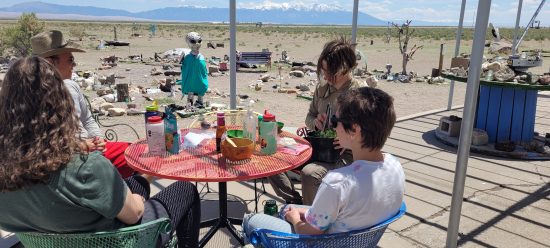 Cottonwood Alumni gather to listen to information about how to participate in a scientific study on badgers.We stayed at Camp Darkmoon, a couple’s land we found on Hipcamp. They were super friendly and welcoming and allowed for a night of fun games and some delicious spicy gochujang noodles. The land was populated with adobe structures made by the host, as well as a campsite we stayed at.