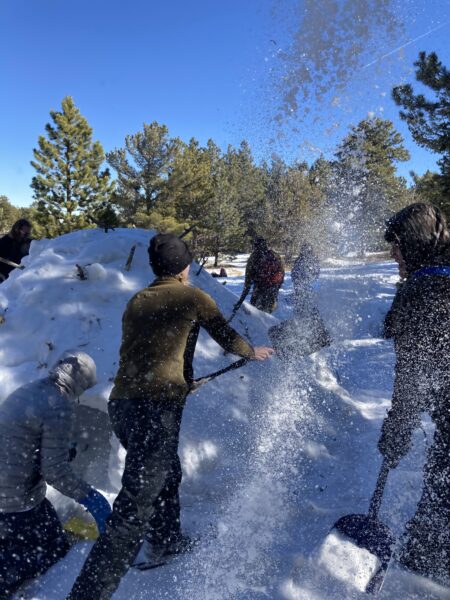 The marvelous CAP class at Centaurus High were ready; they donned their snowshoes and trudged out to Caribou Ranch lugging their snow shovels. Complete professionals, and hard set to their task, they piled up snow as tall as a (minor) giant. The class was so focused that they didn’t even break to have a snowball fight…. yes, we were so unbelievably focused! With the snow piled up high, we re-fueled our hard workers with burritos and basked in the midday sun. We were then inaugurated into the great Australian tradition of Tim Tam Slamming. For those of you who have yet to experience the finest our Australian friends have to offer, a Tim Tam Slam is the ritual of using a specific cookie as a straw to drink up hot cocoa, and then just as the Tim Tam is melting to snarf it up as quickly as possible!