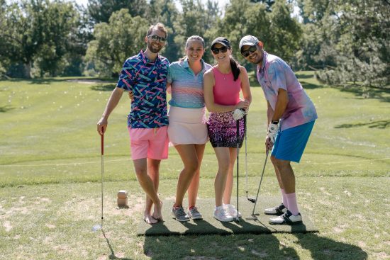 A team of 4 poses on the green at the Harvard Gulch 2023 Golf Tournament