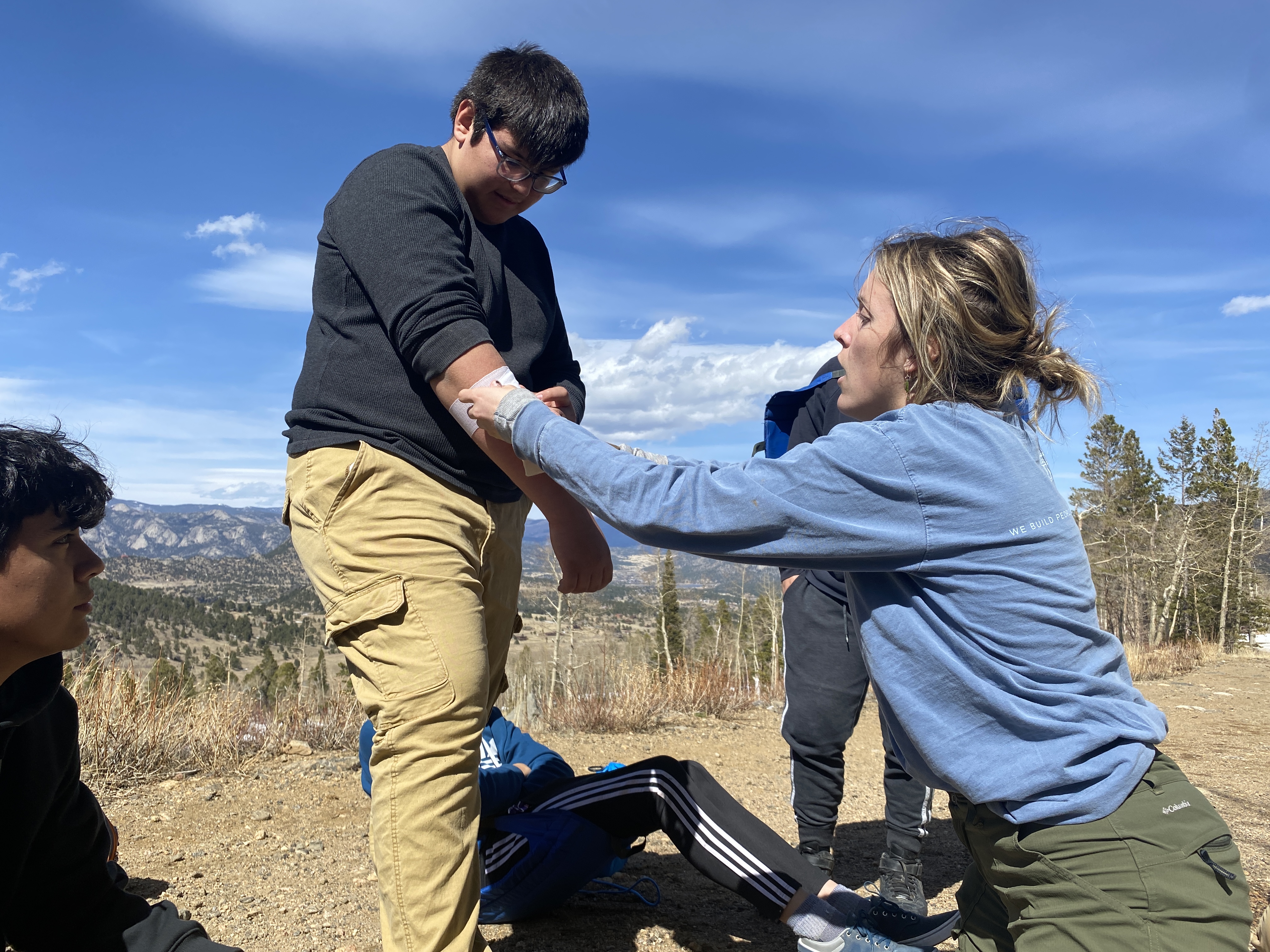 A cada estudiante se le dio en secreto una lesión o un factor de estrés que debía representar en un escenario médico. Cada escenario implicaba diferentes protocolos y pasos de acción para garantizar la seguridad del paciente. Uno de los alumnos fingió romperse la muñeca al caerse, otro se dislocó la rodilla y se rompió un hueso, además de otras sorpresas. Los estudiantes entraron en acción con el apoyo de nuestra instructora Sadie, técnica de emergencias médicas, para aprender a tratar adecuadamente los problemas. Los estudiantes aprendieron a estabilizar las lesiones utilizando elementos que ya tenían en el camino, como una almohadilla para dormir, chaquetas, pantalones, un bastón de senderismo y una mochila. Por suerte, todas las lesiones eran falsas y no tuvimos que poner en práctica ninguna de las técnicas aprendidas.