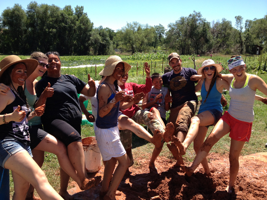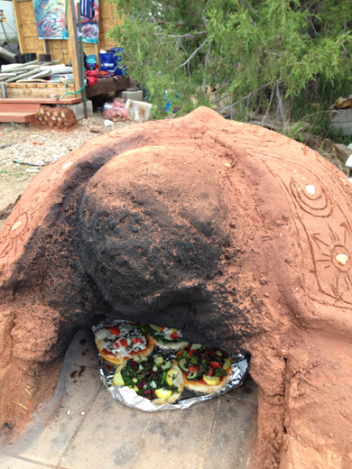 pipes, helping the farmers move the sprinklers in half the time it would normally take. We rewarded ourselves with a frolic through the sprinklers to cool down and ended the morning with a meditation circle, where we learned a Navajo song about beauty and sang and danced in the dewy field. We spent the remainder of the day re-making Shelly Mo, a giant Mother Earth turtle pizza oven that had been washed away in the rain. Everyone got down and dirty mixing together the clay, water and manure mixture to make up her shell. We got the afternoon off at the pool, and after relaxing for a while we went back to the farm to make pizzas in our finished oven. The interns helped us harvest onions, basil, beets, zucchini, kale, and garlic to put on our very own pizzas! We even got to have pesto sauce made from all the basil we picked the day before.