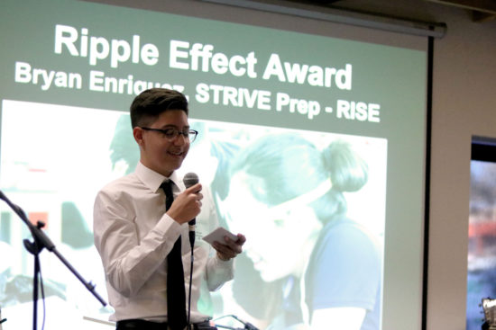 I am honored to accept this award. I just wanted to say Cottonwood is such a great class…my class is making a solar powered charging station so that students can think of energy as something other than just an outlet. Eventually the idea of using coal for energy can become obsolete. Cottonwood is a once in a lifetime opportunity and I support their actions as a non profit organization. Bryan Enriquez, STRIVE Prep – RISE Student