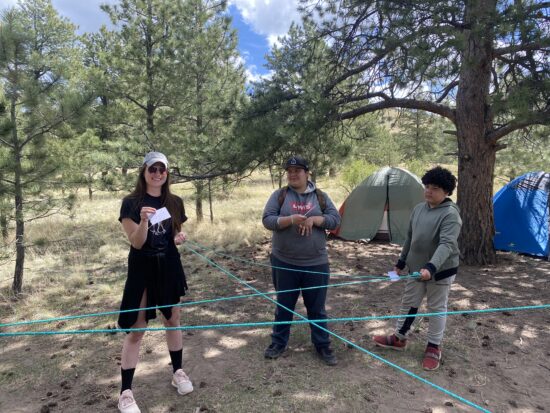 After an extremely busy day for both the group and the wolves, we took the morning to learn new skills at the campsite, while the wolves took time to wake up from their food coma after such a large meal! The group broke off into smaller groups to learn map and compass skills and whittling. We put their new skills to the test through a Navigation Challenge, where teams used a compass to find their hidden food, water, and shelter resources they would need to be able to survive in the game. After learning basic survival needs, the group began to learn about animal interactions and food webs within our ecosystem, including how wolves fit into the ecosystem. Are wolves a part of the ecosystem in Colorado? This question was left unanswered as the group learned about the past, present, and future of wolves in Colorado. As students pondered the question, they thought about how wolves would interact with other animals if they were currently in our ecosystem. We talked about how predators and prey interact, and students learned the game camouflage and proved to be masters. Students hid in the tall grasses and crept up on their “prey” for a successful hunt!